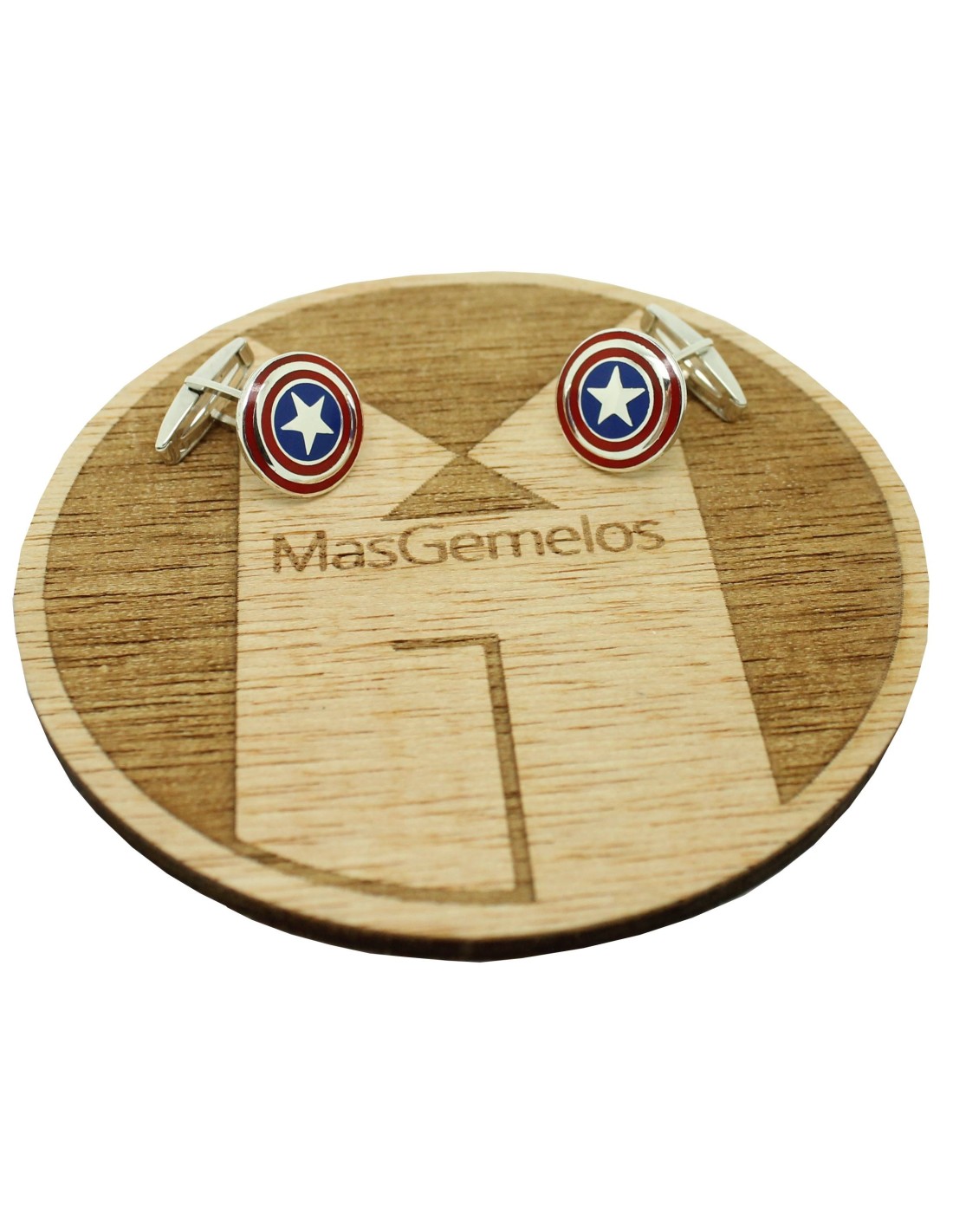 أزرار قميص كابتن أمريكا الفضة من الدرجة 925 مصنوعة من الفضة من الدرجة الأولى بحرف اليد ، والتي تمثل درع كابتن أمريكا في اللون المسمر الذي يحمله دائمًا كسلاح دفاع وهجوم واحد.