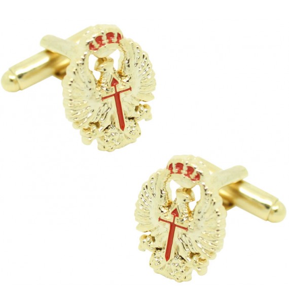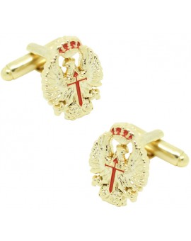 Cufflinks for the shield shirt of the Army of Earth de España made of steel, bathed in rhodium and enamelled with the colors of the coat of arms of the Legion and the flag of Spain in black background representing the shield of the terrestrial branch of the Spanish Armed Forces , one of the oldest active armies in the world, having been in service since the 15th century.