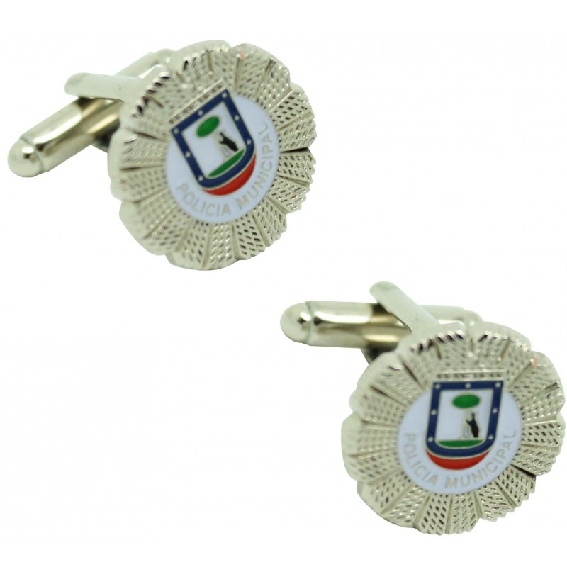 Cufflinks for Madrid Municipal Police shirt made of steel with rhodium plating and enamelled in the colors of the official Madrid plaque, which represents the plaque of the local body of the Municipal Police of Madrid and which is within the Corps and Forces of security dependent on the City of Madrid.