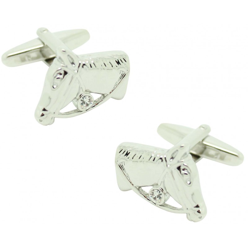 Cufflinks for horse head shirt with crystal made of steel and rhodium plated that represents the shape of a horse head with its harness and white crystal.