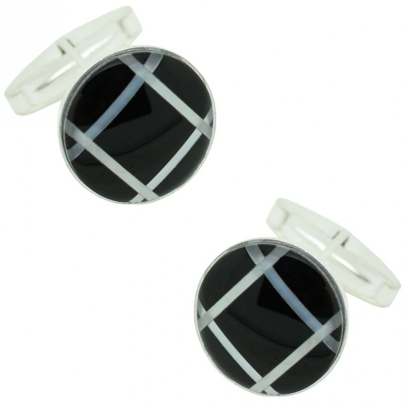 أزرار أكمام من الفضة الاسترليني مع حجر العقيق الأسود وخطوط العقيق الأبيض.