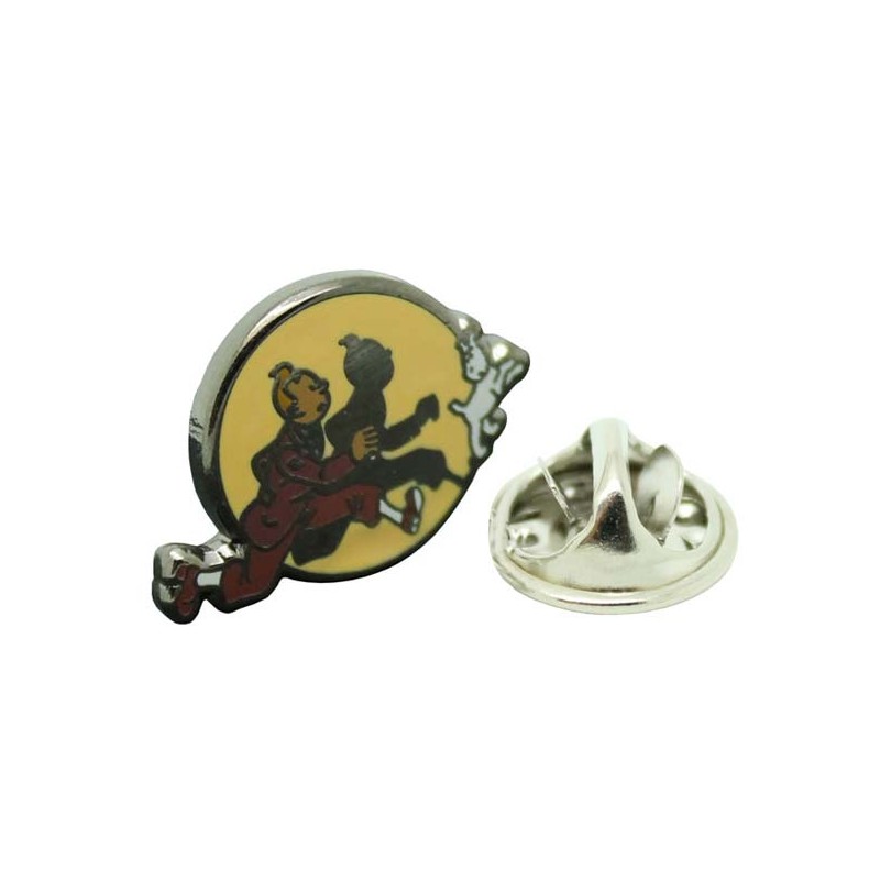 TinTin lapel pin made of steel with black rhodium bath and enameled in the colors of TinTin comic character representing the figure of TinTin and Milu running.