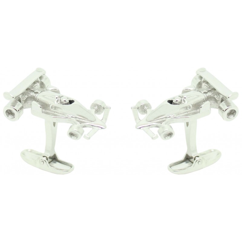 Silver Formula 1 shirt cufflinks made of steel and rhodium plated representing a Formula 1 car with a driver.