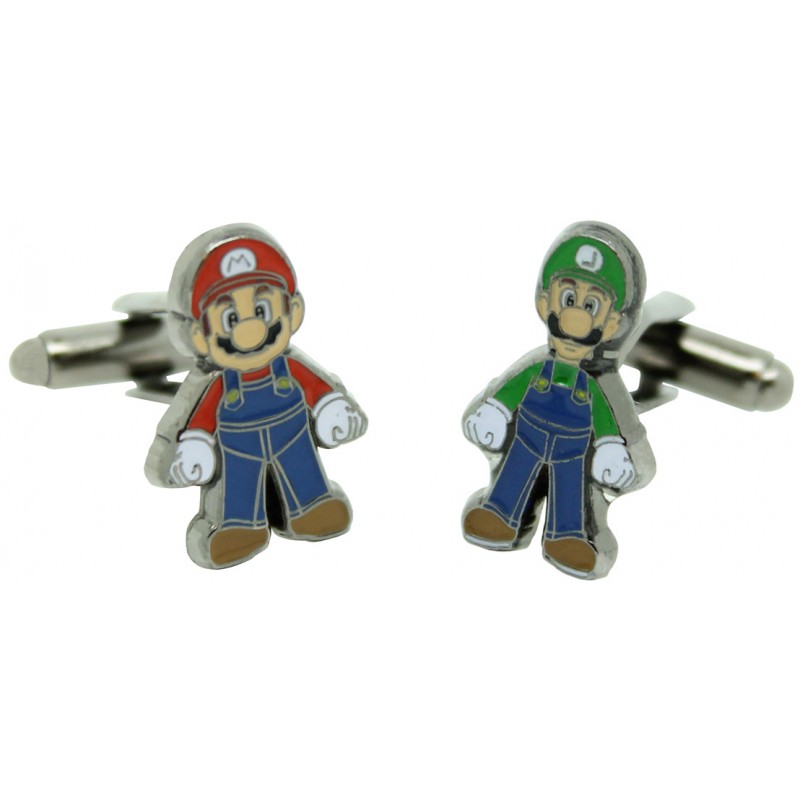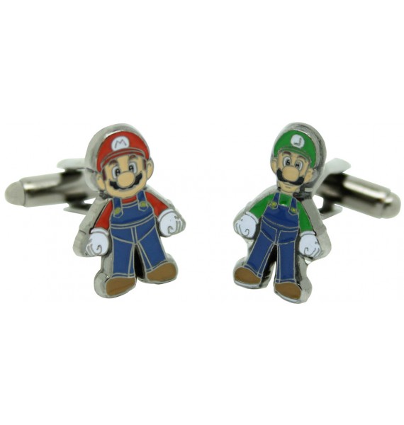 Cufflinks of Mario and Luigi the main characters from Mario Bros. video game. In the game, Mario is portrayed as an Italian-American plumber who, along with his younger brother Luigi, has to defeat creatures that have been coming from the sewers below New York City. The gameplay focuses on Mario's extermination of them by flipping them on their backs and kicking them away.