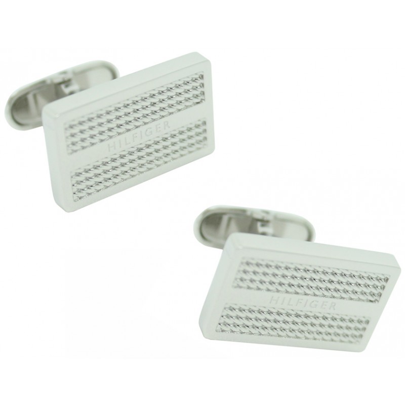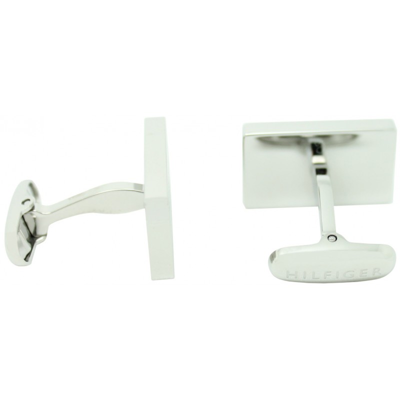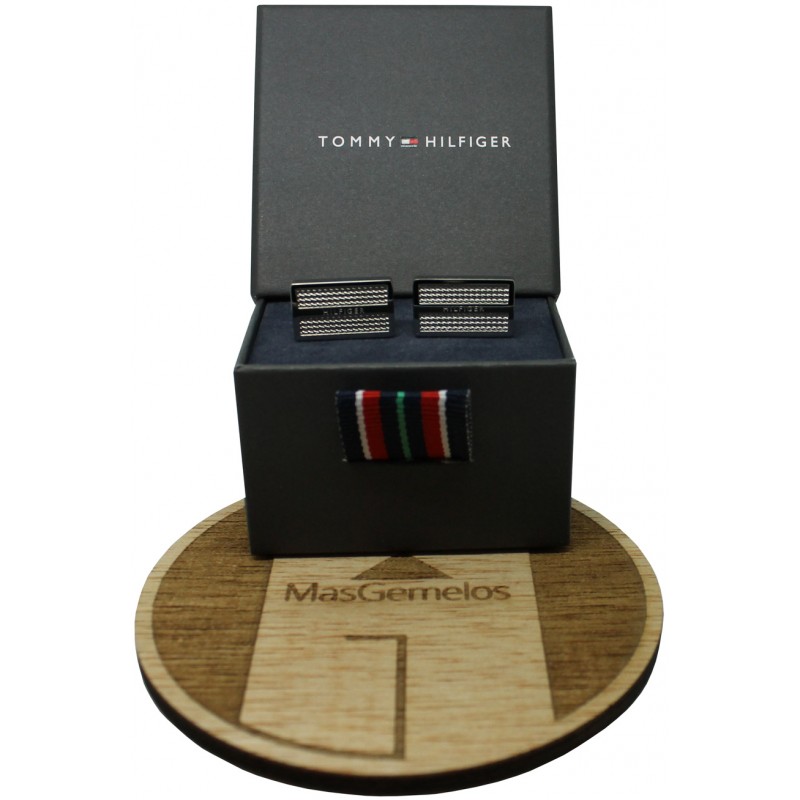 أزرار قميص تومي هيلفيجر ذات الشكل المستطيل ورسم العقدات مع حروف هيلفيجر محفورة في الوسط. 100% من الفولاذ المقاوم للصدأ.
