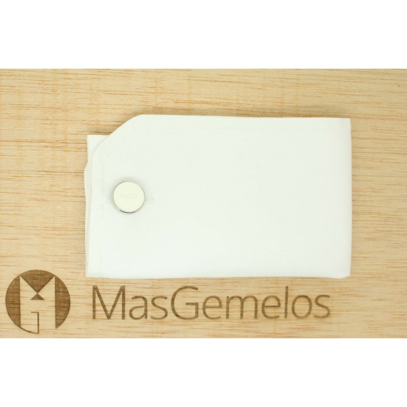 Es wird dieses Roundel-Design vorgestellt weiß classic HUGO , handpoliertes stück mit einem auf festem verschluss eingravierten logo, das eine subtile unterscheidung bietet und eine der berühmtesten luxusmarken für männer in anzügen und accessoires ist.