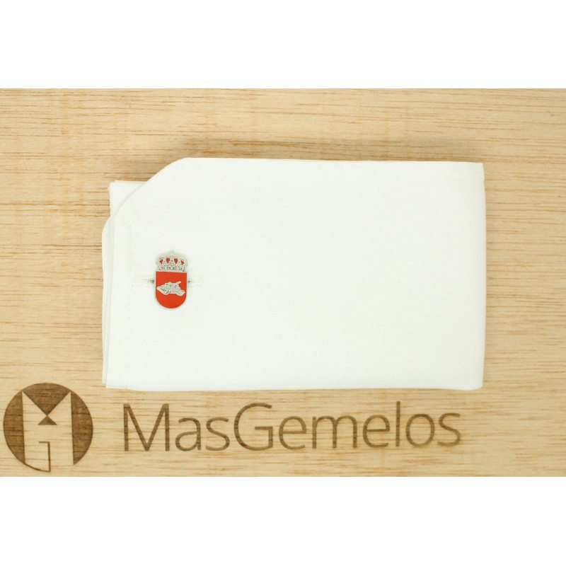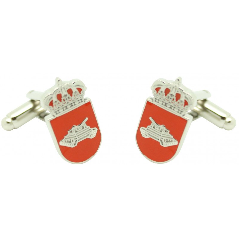 Zwillinge für Trägerhemd aus stahl gefertigt und in rhodium beschichtet, das das emblem der schweren streitkräfte darstellt, mit einer krone oben und einem tank im inneren des schildes.