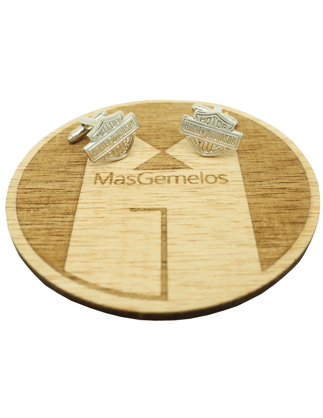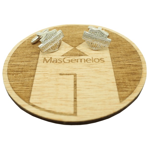 Harley-Motorrad-Manschettenknöpfe aus Stahl mit Rhodiumbeschichtung, die das silberne Emblem einer der legendärsten Motorradmarken darstellen.