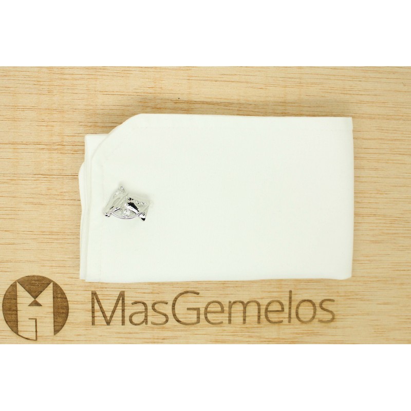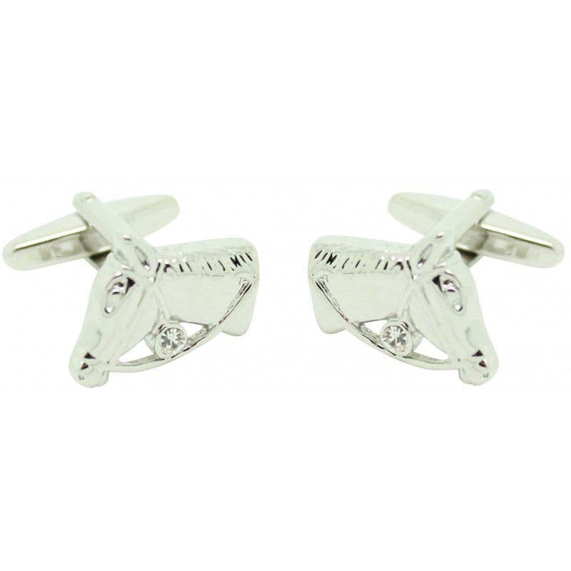 Zwillinge für Hemd Kopf Pferd mit Glas aus stahl gefertigt und in rhodium beschichtet, das die form eines pferdekopfes mit seinem reifen und weißem glas darstellt.