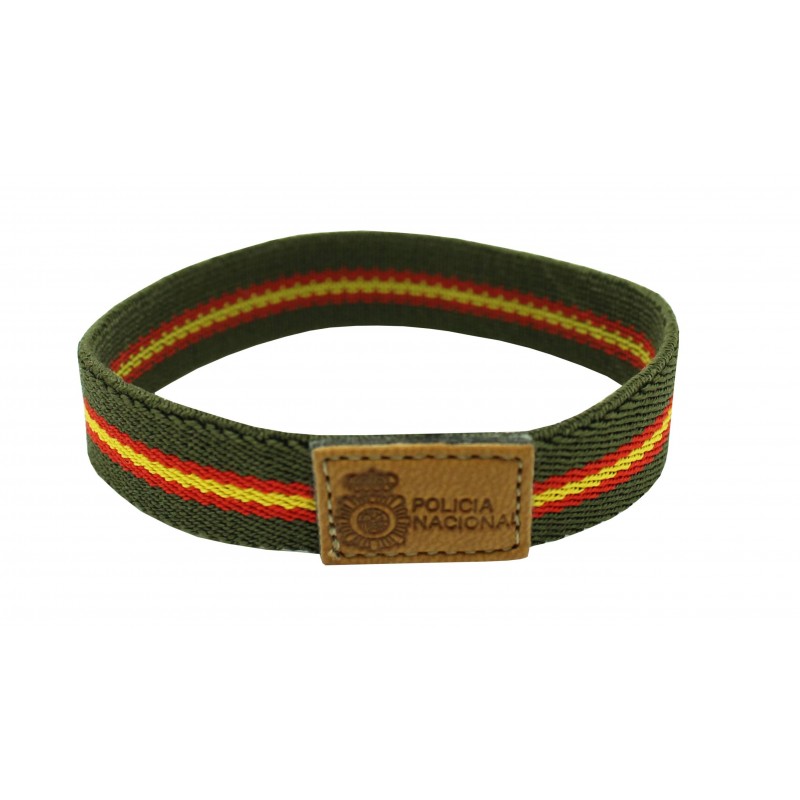 Spanische Flaggenarmband aus grünem elastischem Stoff, das die Farben der spanischen Flagge und das Wappen der Nationalpolizei darstellt.
