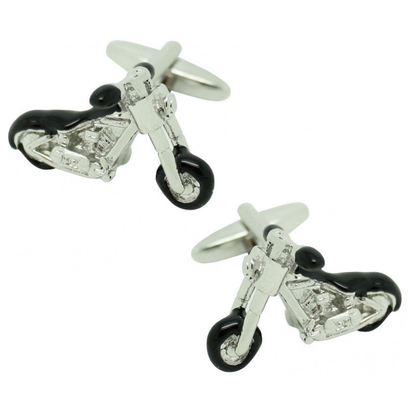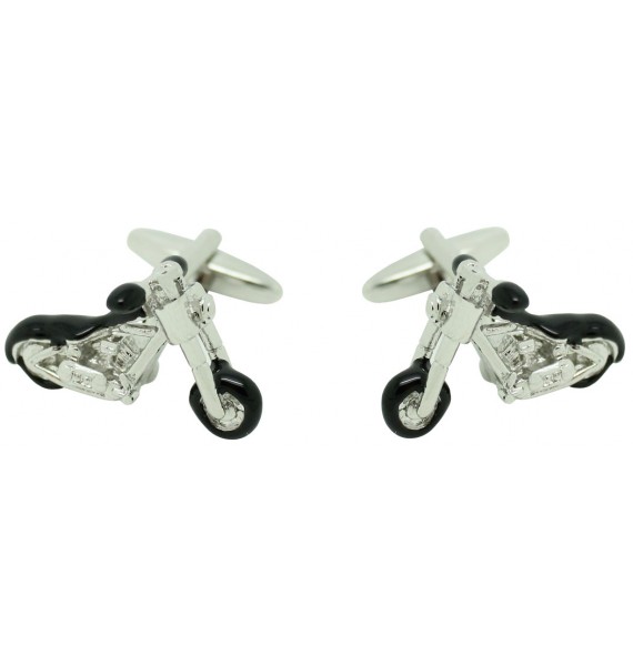 These cufflinks are a replica for a chopper, a type of custom motorcycle which emerged in the United States in the mid-1960s. The chopper is perhaps the most extreme of all custom styles, often using radically modified steering angles and lengthened forks for a stretched-out appearance. They can be built from an original motorcycle which is modified ("chopped") or built from scratch. Some of the characteristic features of choppers are long front ends with extended forks often coupled with an increased rake angle, hardtail frames (frames without rear suspension), very tall "ape hanger" or very short "drag" handlebars, lengthened or stretched frames, and larger than stock front wheels. The "sissy bar", a set of tubes that connect the rear fender with the frame, and which are often extended several feet high, is a signature feature on many choppers.