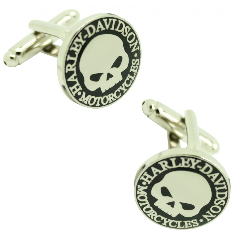 Gemelos para camisa Harley Davidson motorcycles realizados en acero con baño en rodio y esmaltado en color negro, que representa el logotipo de Harley Davison con la calavera