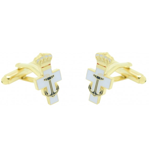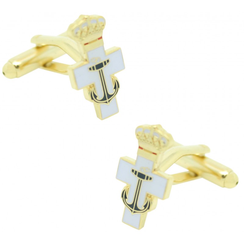 Gemelos para camisa medalla cruz del mérito naval con distintivo blanco realizados en acero y bañado en rodio dorado que representa la cruz del mérito naval que es el nombre de una condecoración militar de España que tiene por objeto recompensar a los miembros de la armada y está cruz representa los servicios o misiones que ordinaria o extraordinariamente sean encomendados a las Fuerzas Armadas o relacionados con Defensa por méritos, trabajos o servicios distinguidos.
