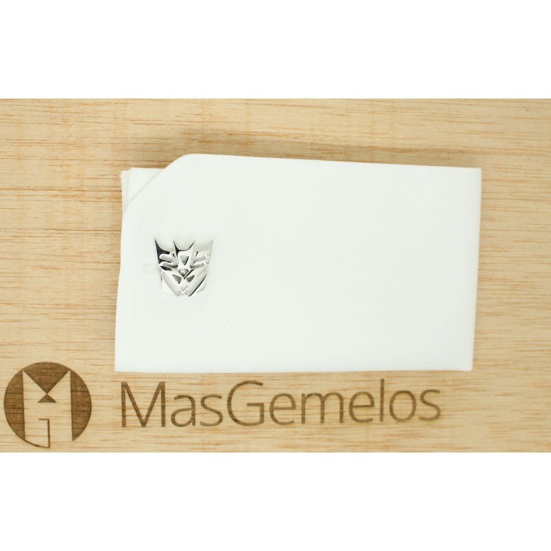 Gemelos para camisa Autobots y Decepticons con huecos realizados en acero y bañado en rodio que representa los escudos de los famosos coches convertibles de transformers