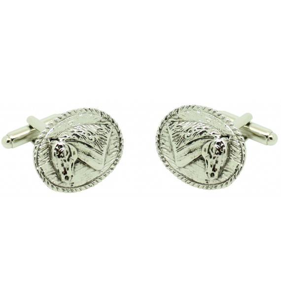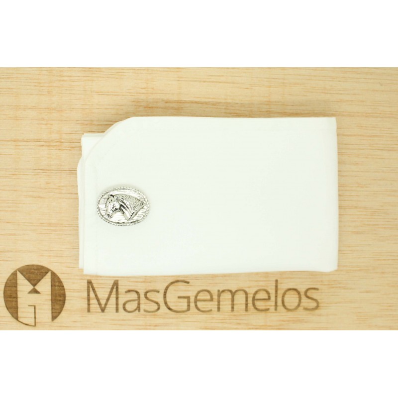Gemelos para camisa figura ovalada caballo realizados en acero y bañado en rodio que representa la cabeza de un caballo en un oval.