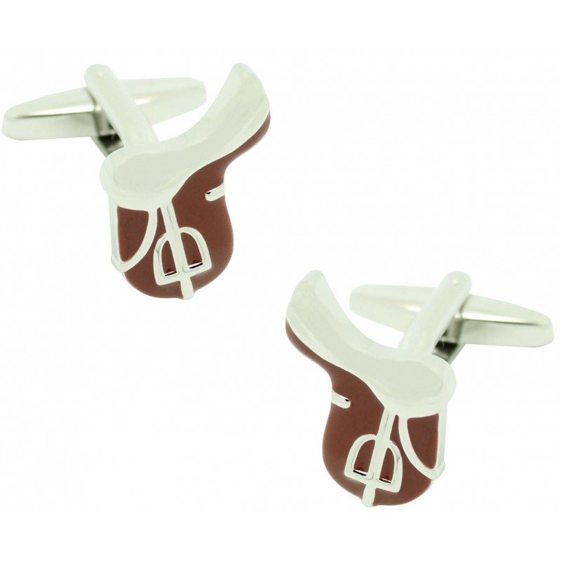 Gemelos para camisa montura de caballo realizados en acero y bañado en rodio que representa la forma de una montura marrón que se pone para montar en un caballo.