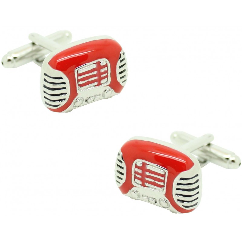 Gemelos para camisa transistor de Radio rojo realizados en acero y bañado en rodio, esmaltado en color rojo que representan la Radio retro que se caracterizaba por sintonizar los canales de la Radio junto a su altavoz.