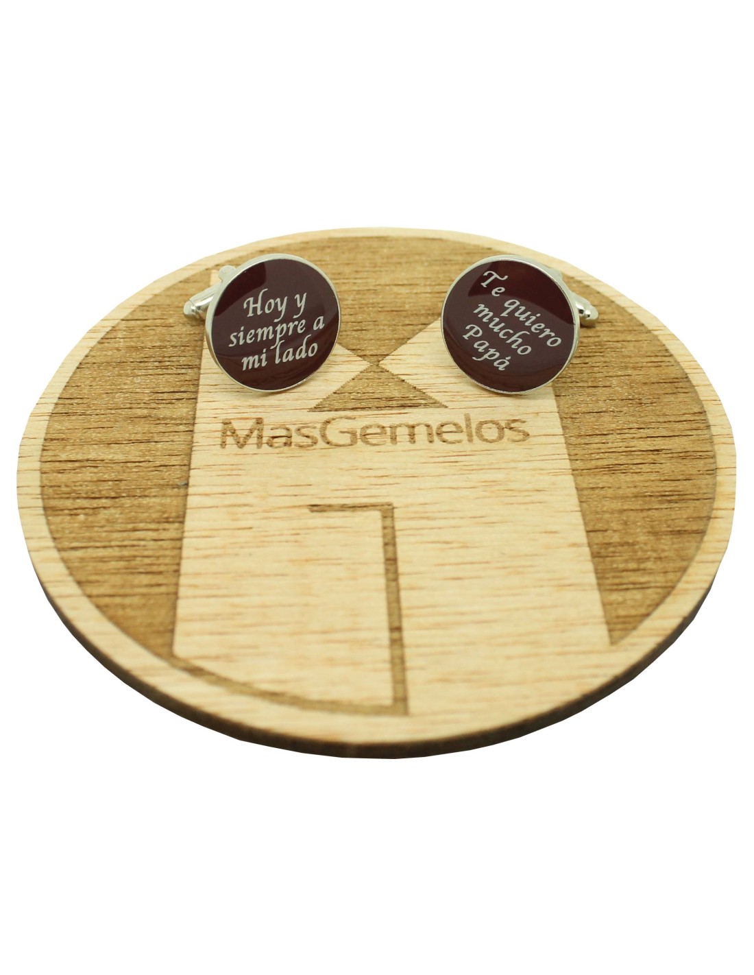 Gemelos para camisa de Boda con frase Hoy y Siempre a mi lado y Te quiero mucho Papá realizados en Alta calidad de acero y bañado en rodio color granate.