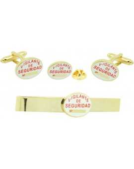 Pack de gemelos para camisa además de pasador y Pin de solapa de Vigilante de seguridad realizados en acero y bañado en rodio con esmalte en los colores de las palabras de la placa que representa el escudo oficial de los Vigilantes de seguridad.