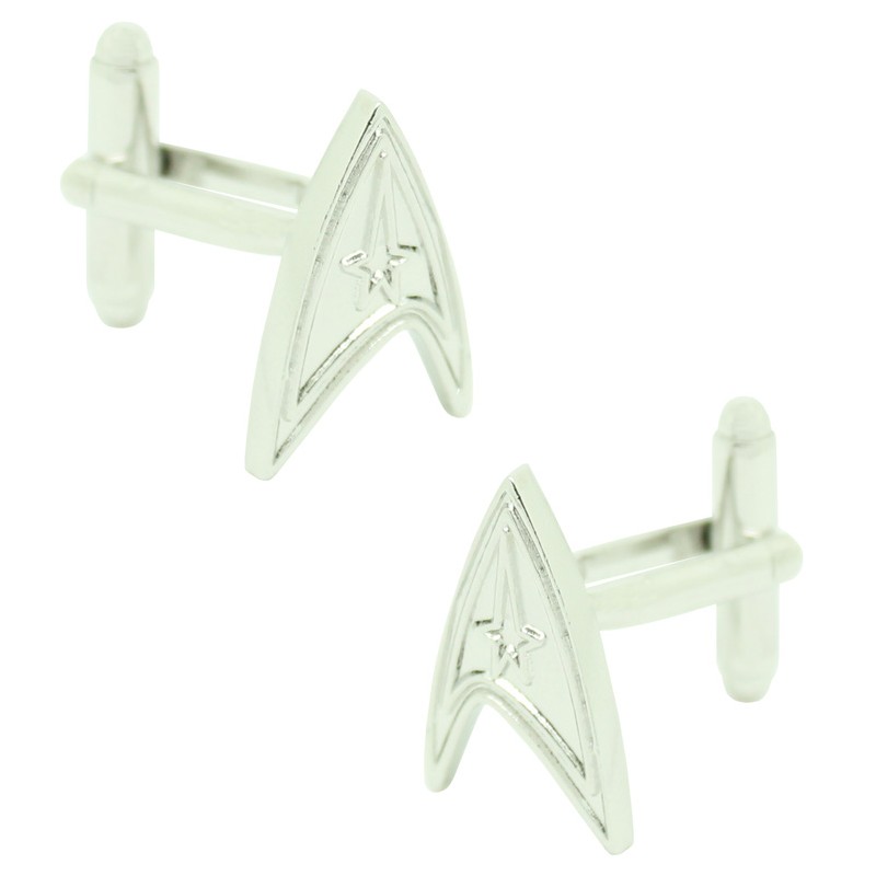 Des jumelles pour une chemise Star Trek en argent qui montre le bouclier de la série et du film Star Trek en argent.