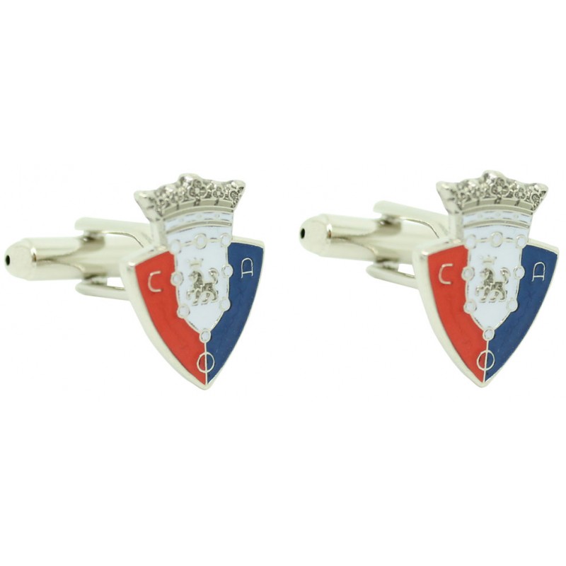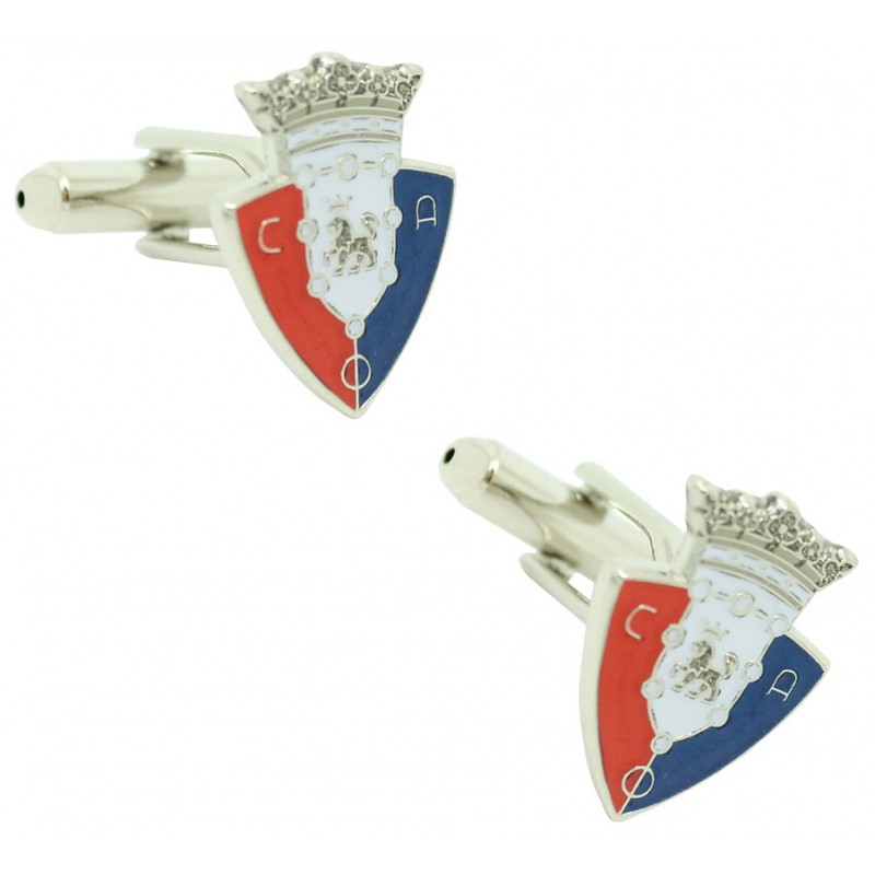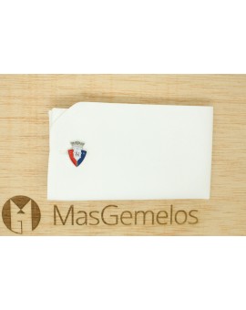 Des jumeaux pour le maillot écusson Club Atlético de Osasuna réalisées en acier, baignées en rhodium et émaillées avec les couleurs du bouclier du Club de football qui participe à la Ligue espagnole à Pampelune et dans la province de Navarre.