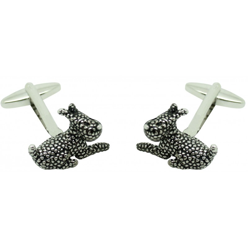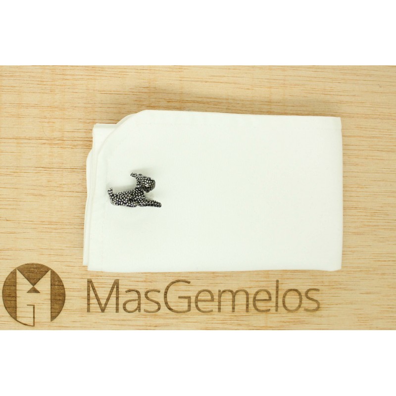 Des jumeaux pour chemise de chien Milu argenté réalisées en acier et baignées en rhodium représentant le chien de Milo dans Tintin.