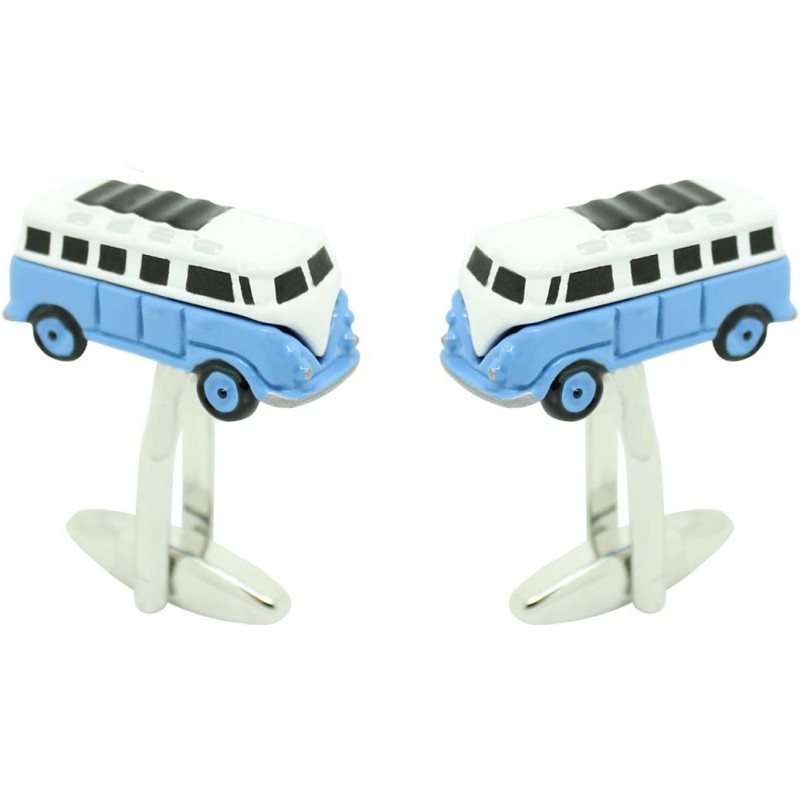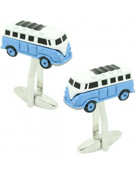 Des jumeaux pour la chemise bleue Hippie réalisés en acier et revêtus de rhodium, émaillés en bleu et blanc représentant la camionnette la plus célèbre des années 80 et la plus originale.