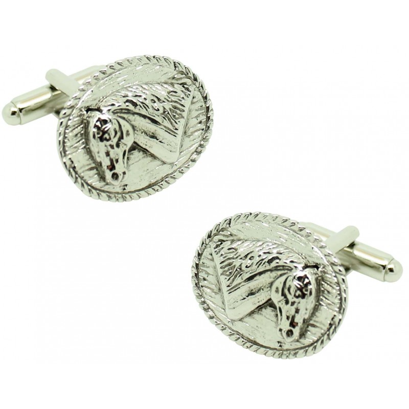 Jumeaux pour chemise figure ovale cheval réalisés en acier et revêtus de rhodium représentant la tête d'un cheval sur un ovale.