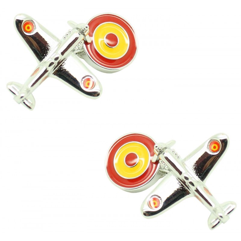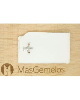 Jumeaux pour chemise 3D avionette avec des écarpins d'Espagne réalisé en acier et baigné en rhodium qui représente la forme d'un avion de combat identifié par l'escarpelle qui est le cercle d'aviation de l'Espagne ainsi que dans la fermeture avec escarpelle avec chaîne.