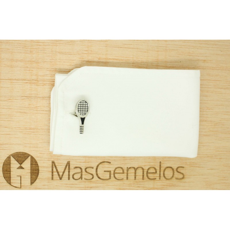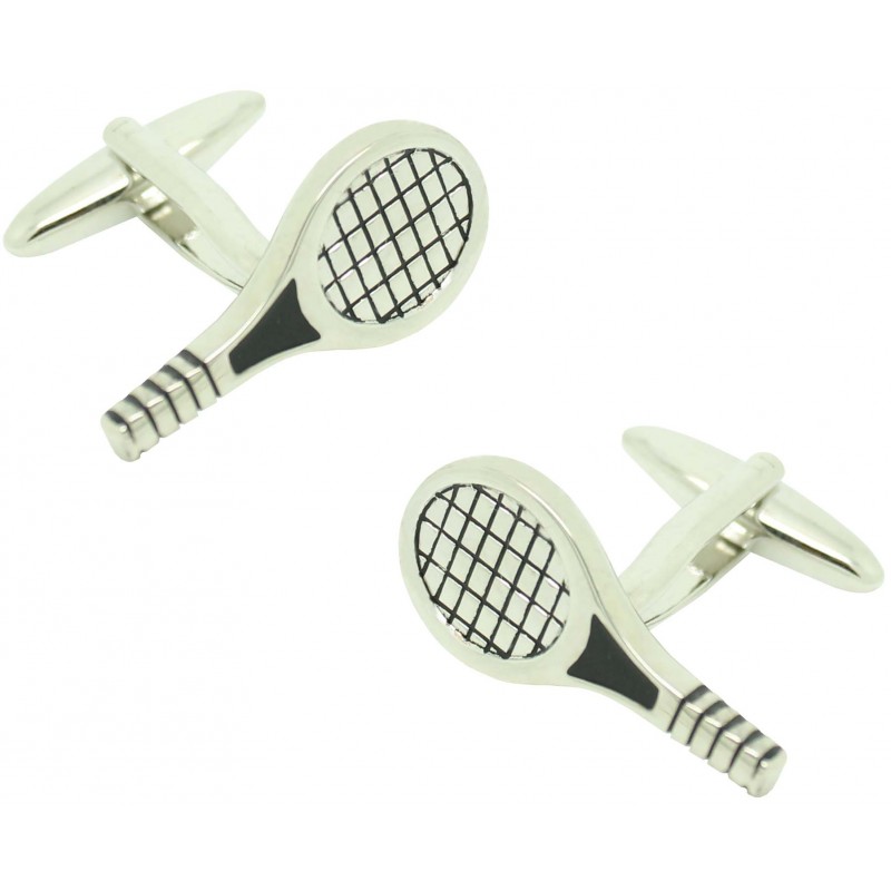 Des jumelles pour chemise des raquettes de tennis argentées réalisé en acier et recouvert de rhodium représentant des raquettes de tennis argentées en 3D.