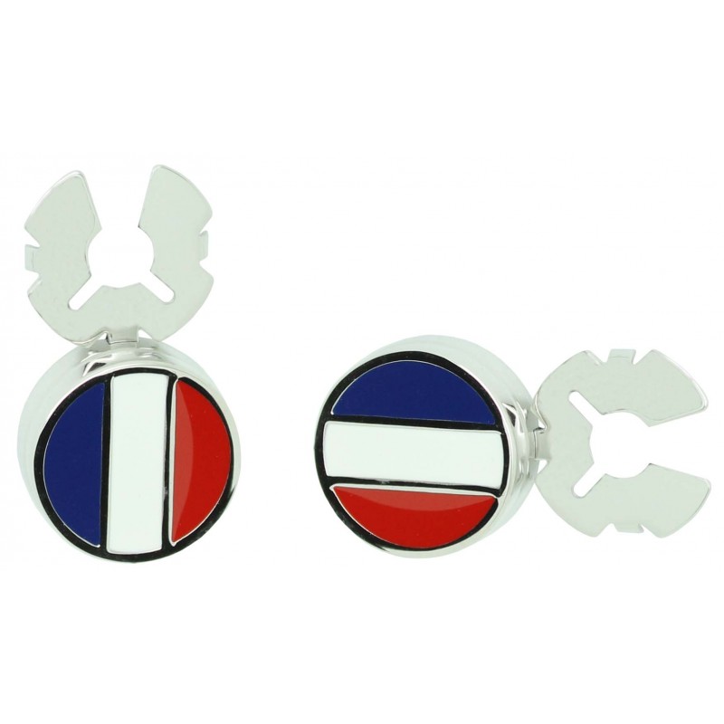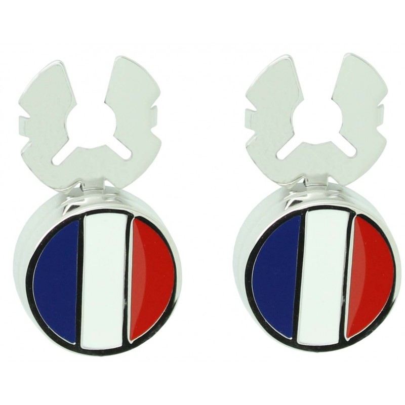 Couvre-boutons pour chemise drapeau France réalisés en acier et revêtus de rhodium, émaillés dans les couleurs rouge et jaune représentant le drapeau de France de manière circulaire.