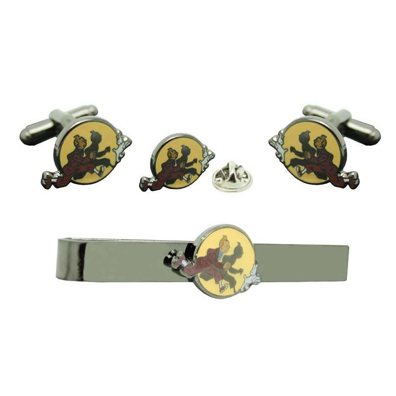 Paquet de jumelles pour chemise en plus de pinceau et Pin de la pochette TinTin réalisés en acier avec bain en rhodium noir et émaillés dans les couleurs du personnage de bande dessinée TinTin représentant la figure de TinTin avec son chien Milú courant ensemble.