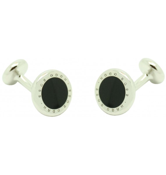 Des jumelles pour chemise de forme ronde en couleur noir et avec des lettres jumelles par Hugo Boss fabriqué en laiton et baigné en rhodium de la plus haute qualité.