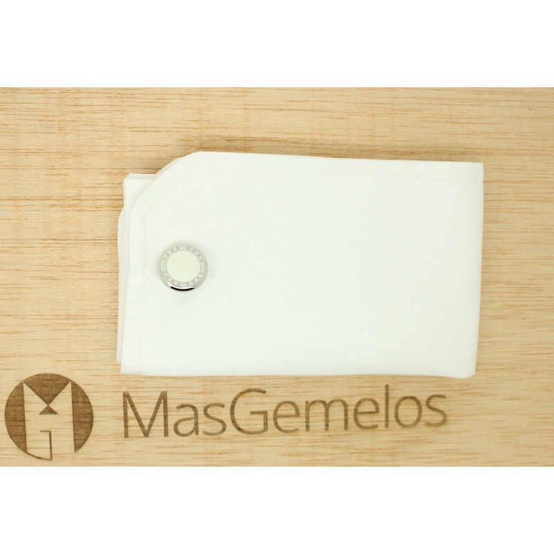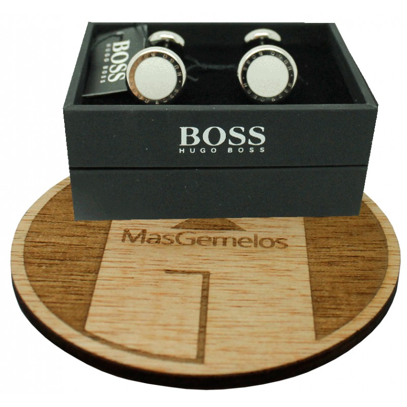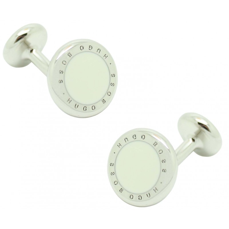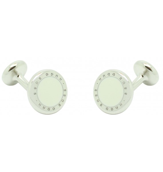 Des jumelles pour chemise de forme ronde en couleur blanc et avec des lettres jumelles par Hugo Boss fabriqué en laiton et baigné en rhodium de la plus haute qualité.