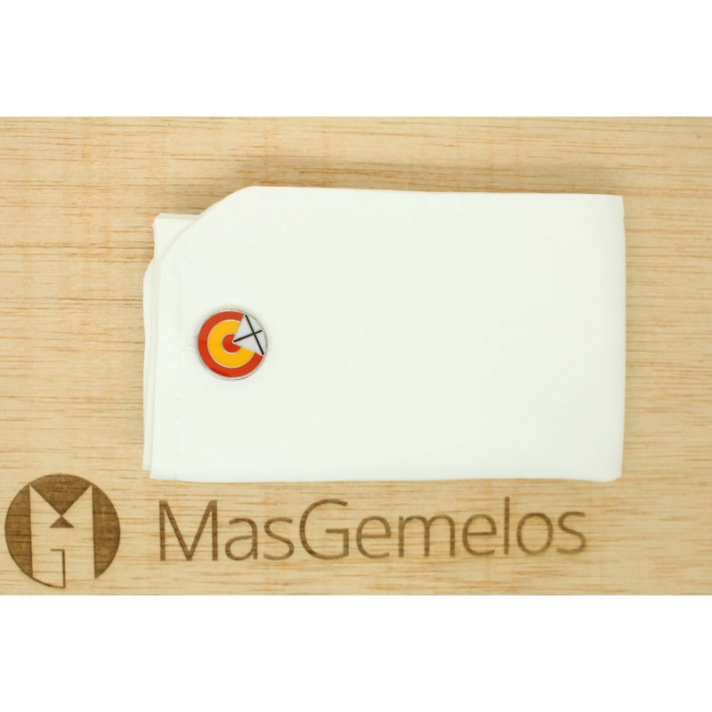 Gemelli per camicia scarapela Spagna con Croce di San Andrés realizzati in acciaio e bagnati in rodio con smalto nei colori giallo e rosso che rappresenta il martirio di Sant'Andrea Apostolo ed è la rappresentazione di umiltà e una variante alla Croce di Sant'Andrea è la Croce di Borgogna, per cui questa scarappella viene visualizzata principalmente su aerei militari e piloti.