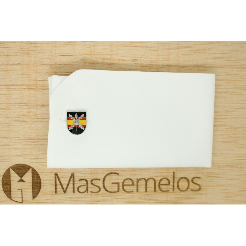 Gemelli per camicia stemma della Confraternita della Legione realizzati in acciaio, bagnati in rodio e smaltati con i colori dello scudo della Legione e della bandiera spagnola sul fondo nero che rappresenta lo scudo della forza militare guidata e creata nel 1920 da José Millán-Astray all'interno dell'Esercito di Terra Spagnola.