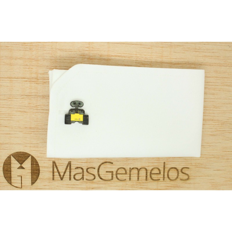 Gemelli per camicia WALL-E realizzati in acciaio e bagnati in rodio, smaltati in colore che rappresentano l'immagine del robot che lavora raccogliendo terra e che vuole iniziare una grande ricerca attraverso la galassia dalla mano di Eva sua amica moderna Robot.