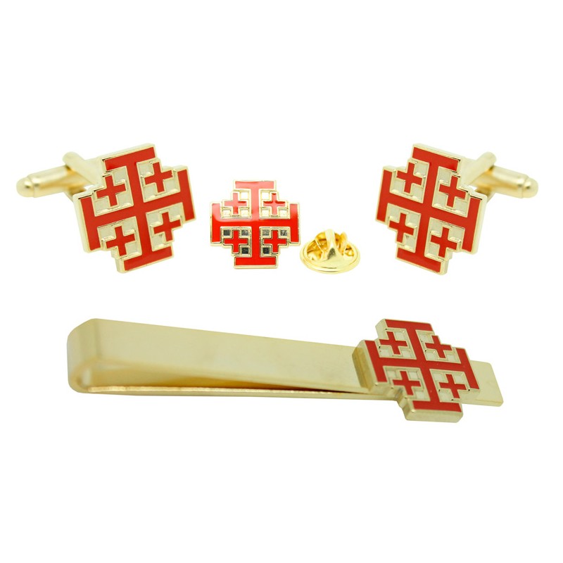 Pacchetto di gemelli per camicia, cravatta e pin con il simbolo dell'Ordine del Santo Sepolcro di Gerusalemme, ordine di cavalleria cattolica che ha le sue origini nella Prima Crociata. Creato nel 1098, è riconosciuto come il più antico Ordine di Cavalleria del mondo. Il suo obiettivo principale era proteggere il Santo Sepolcro dagli infedeli con l'aiuto di 50 cavalieri.