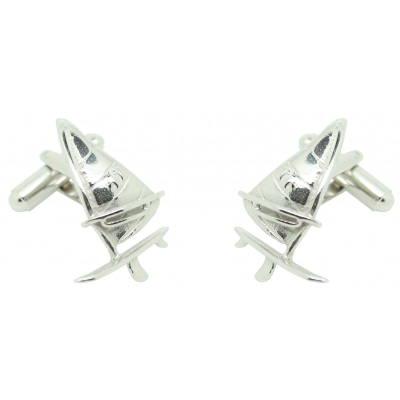 Gemelli per Windsurf 3D realizzati in acciaio e bagnati in rodio che rappresenta la forma di una tavola di windsurf con la sua vela con tutti i dettagli.
