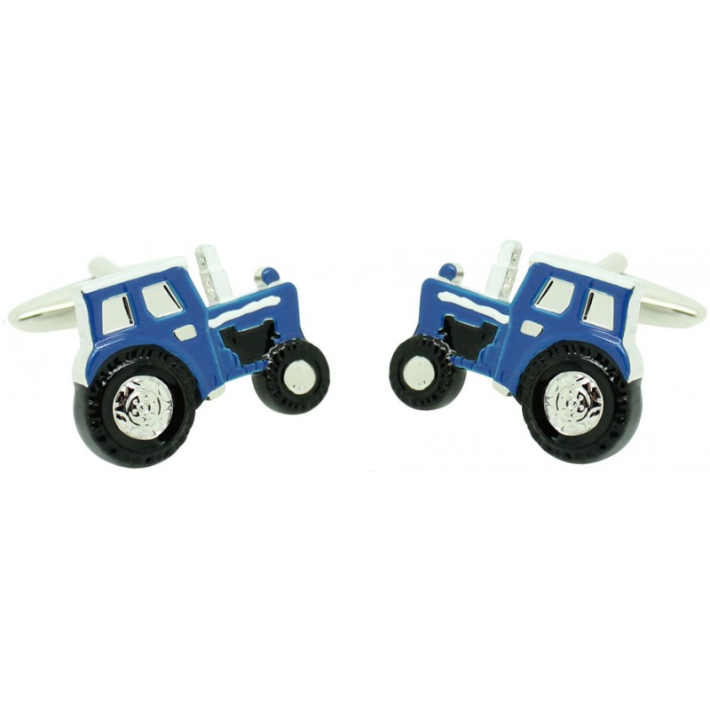 Gemelli per camicia Trattore agricolo blu realizzati in acciaio, bagnato in rodio e smaltato in blu che rappresenta un trattore che viene utilizzato per azionare altri strumenti come l'aratro, la mietitrice, la mietitrice o il rimorchio.