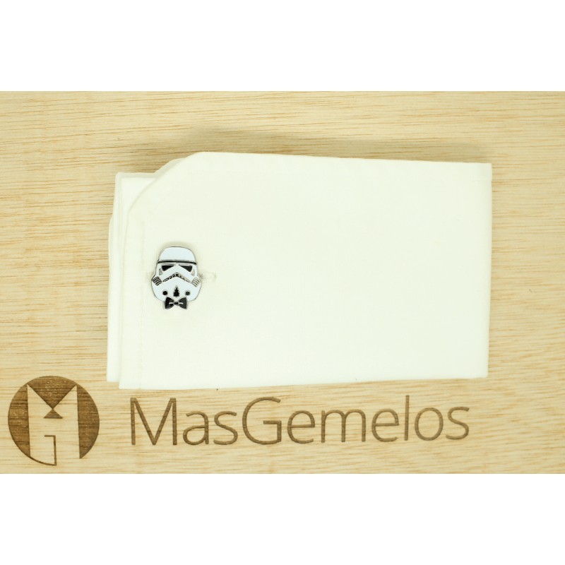 Camicia gemelli Storm trooper con fiocco in acciaio e bagnato in rodio, che rappresenta il casco dei soldati imperiali di Star Wars Storm Trooper.