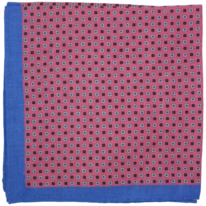 Fazzoletto da taschino rosa con stampa floreale e bordo nei toni del blu.100% Lino.