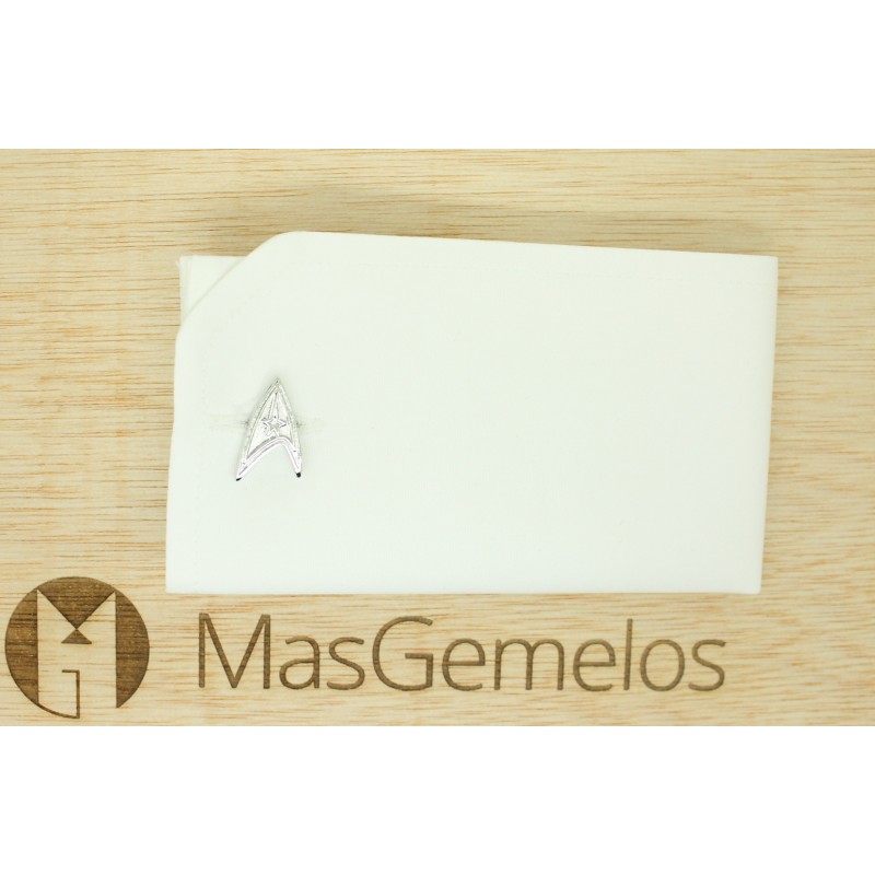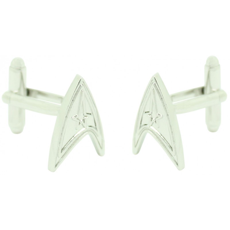 Gêmeos para camisa Star Trek prateada que mostra o escudo da série e posterior filme de Star Trek em prata.