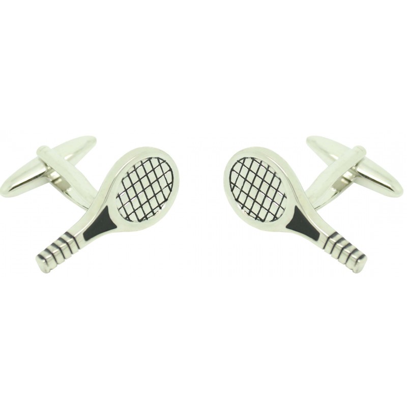Gêmeos de camisa raquetes de ténis prateados feito de aço e revestido de rodio que representa raquetes de ténis prateadas em 3D.