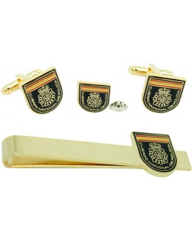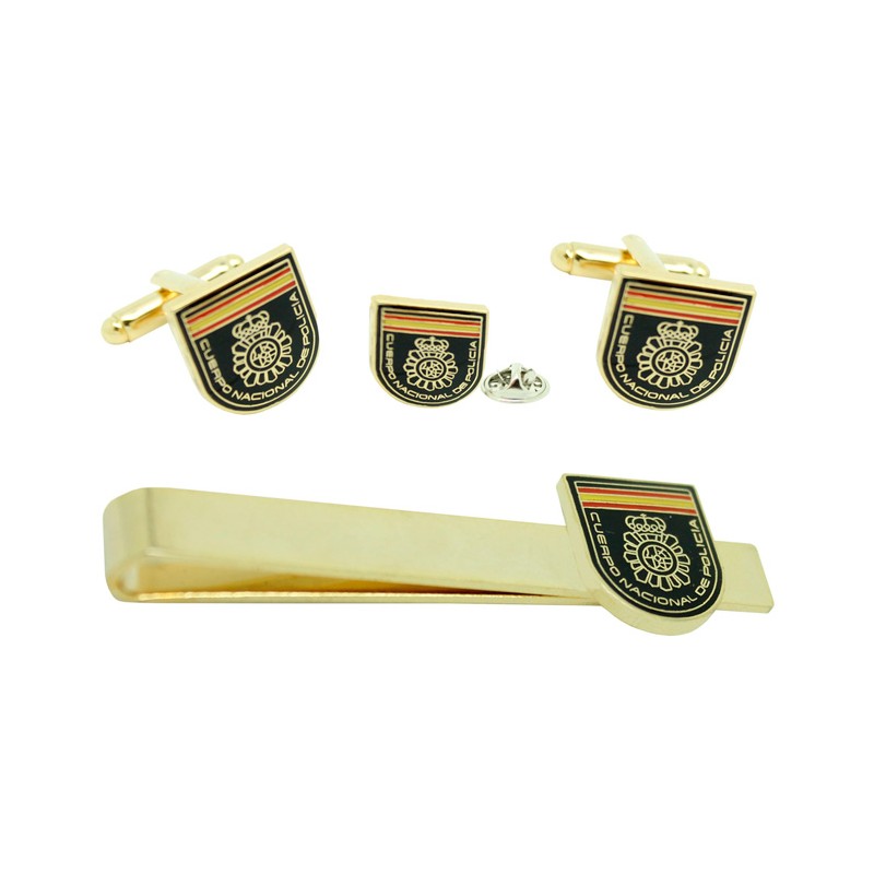 Abotoaduras para camisa, prendedor de gravata e alfinete com emblema do uniforme do Corpo de Polícia Nacional, instituto armado espanhol de natureza civil e responsável pela vigilância policial de áreas urbanas com mais de 20.000 habitantes.