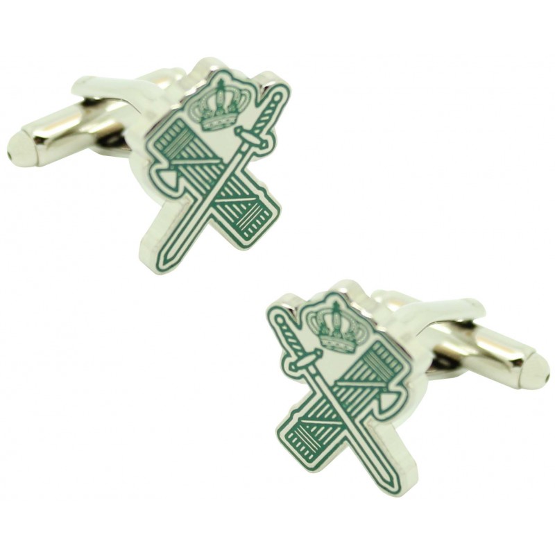 Gêmeos para camisa Faça de licores e espada a Guarda Civil feitas de aço e banhadas em rodio com esmalte de cor verde que representa o emblema da guarda civil com o feixe de lictores e a espada oficial, de um dos corpos e forças de segurança do Estado espanhol.