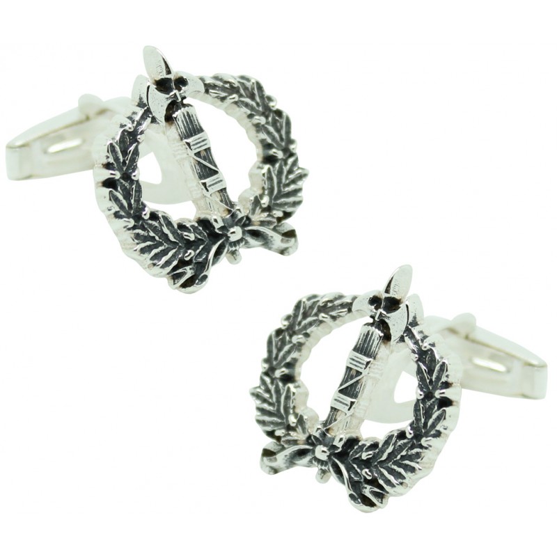 Gêmeos para camisa com o emblema do Corpo Jurídico Militar das Forças Armadas Espanholas em prata de lei 925.