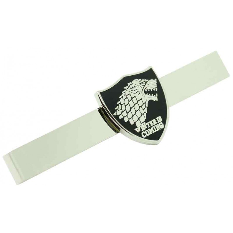 Este pin de gravata representa o emblema da Casa Stark da série de televisão Game of Thrones, um lobo cinzento correndo sobre o gelo. Os Stark governam o Norte há milhares de anos. A lenda diz que são descendentes de Brandon o Construtor, um personagem lendário que é dito ter construído Invernalia e o Parede. Não . Os Stark foram Reis do Norte até à chegada a Westeros de Aegon I Targaryen, que unificou sob conquista os Sete Reinos, altura em que Torrhen Stark, o Rei que se ajoelhou, ele jurou fidelidade.